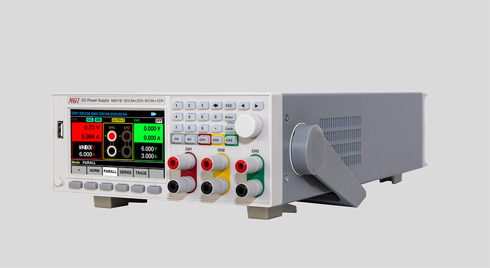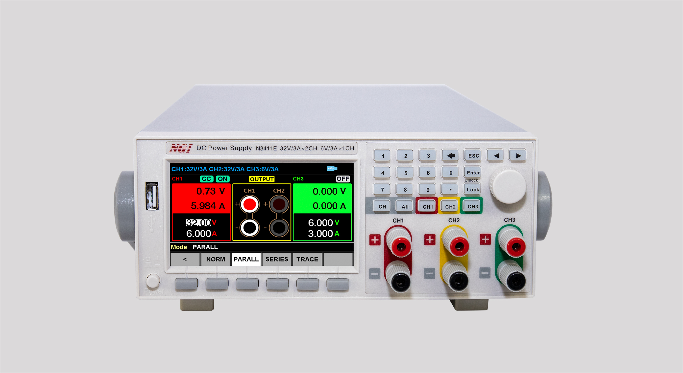 N3410系列電源是NGI全新開發(fā)的一款高性能、高可靠性的三通道可編程直流電源。2U高度半機架寬的機箱,集成三路分別獨立輸出的通道,并且支持前后接線,體積小巧,外形美觀,既有輕巧的桌面支架支撐桌面應(yīng)用,又有便捷的上架特性,方便系統(tǒng)集成。高清大尺寸的LCD顯示屏,可顯示豐富的測試測量信息,DVM測量功能,適應(yīng)多場景測試需求。